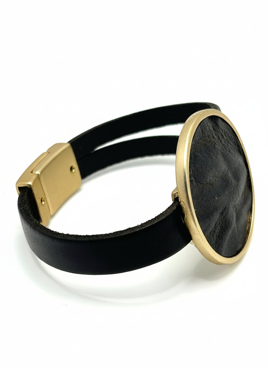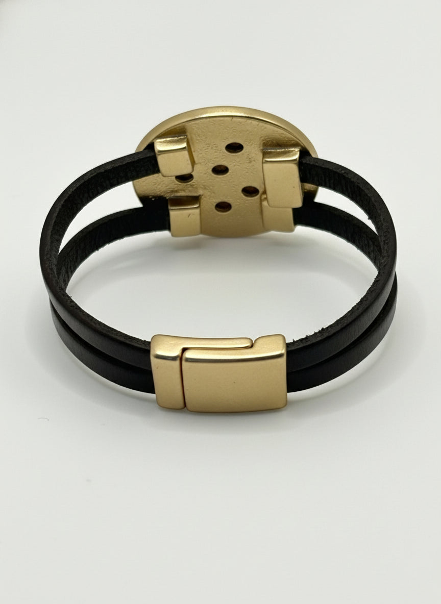 Add a touch of modern charm to your look with the Aura Dusk Cuff, a minimalist leather bracelet featuring two dark-toned leather bands and a deep brown circular pendant framed in elegant gold. The magnetic clasp offers easy, secure wear—perfect for any style that embraces simplicity with a distinctive edge.