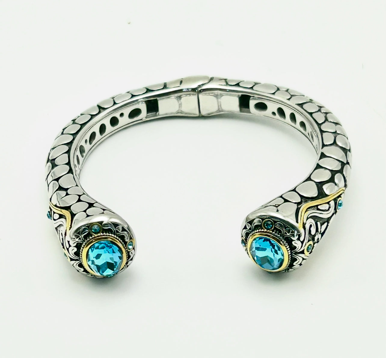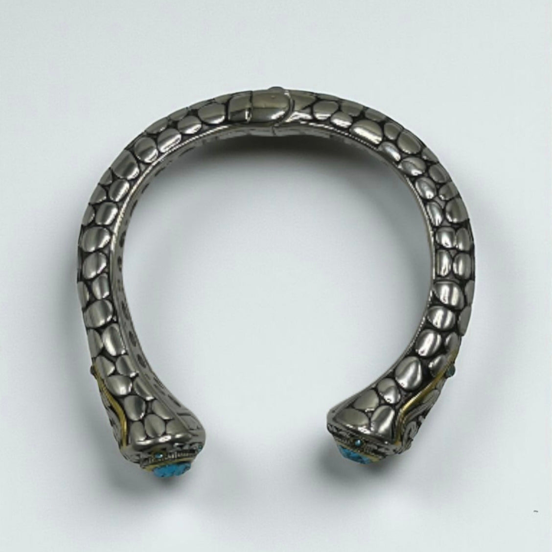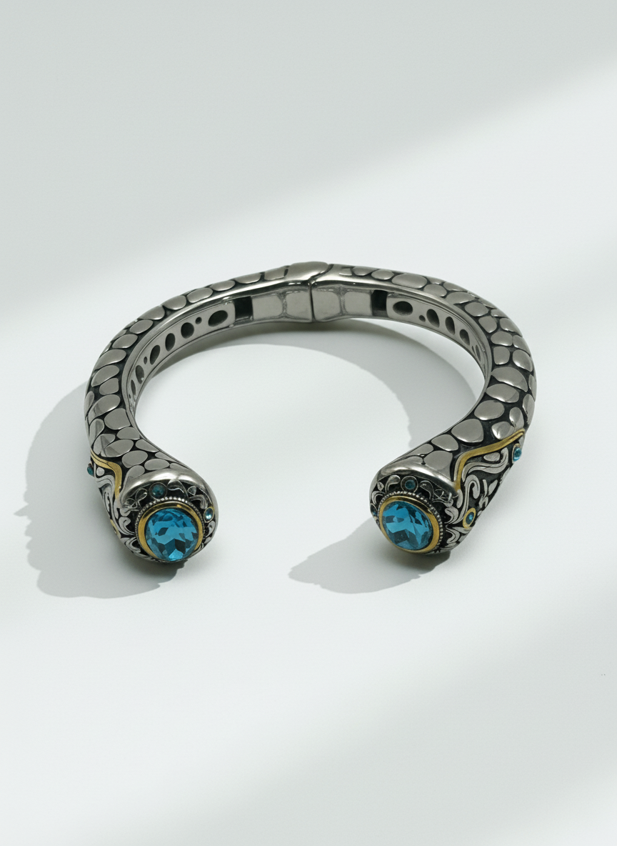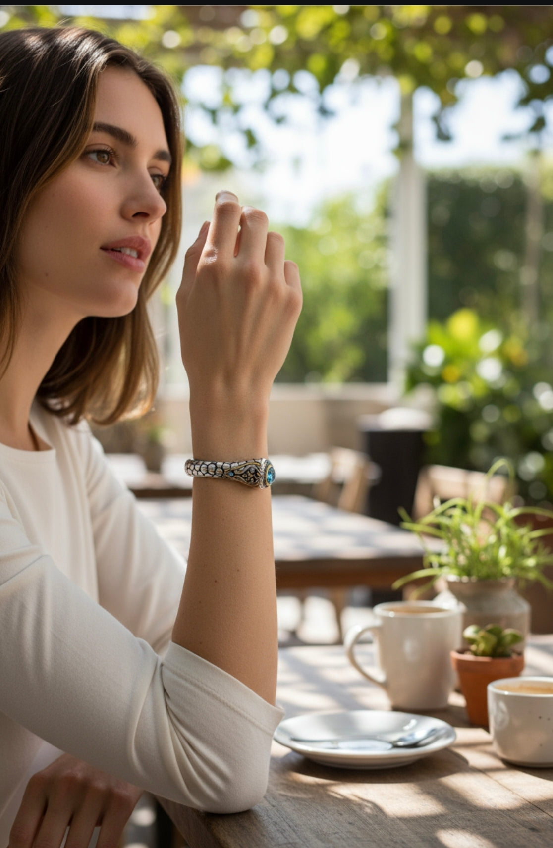 The Azure Fang Bangle channels the spirit of strength and serenity — cool blue stone meeting bold steel in timeless harmony.