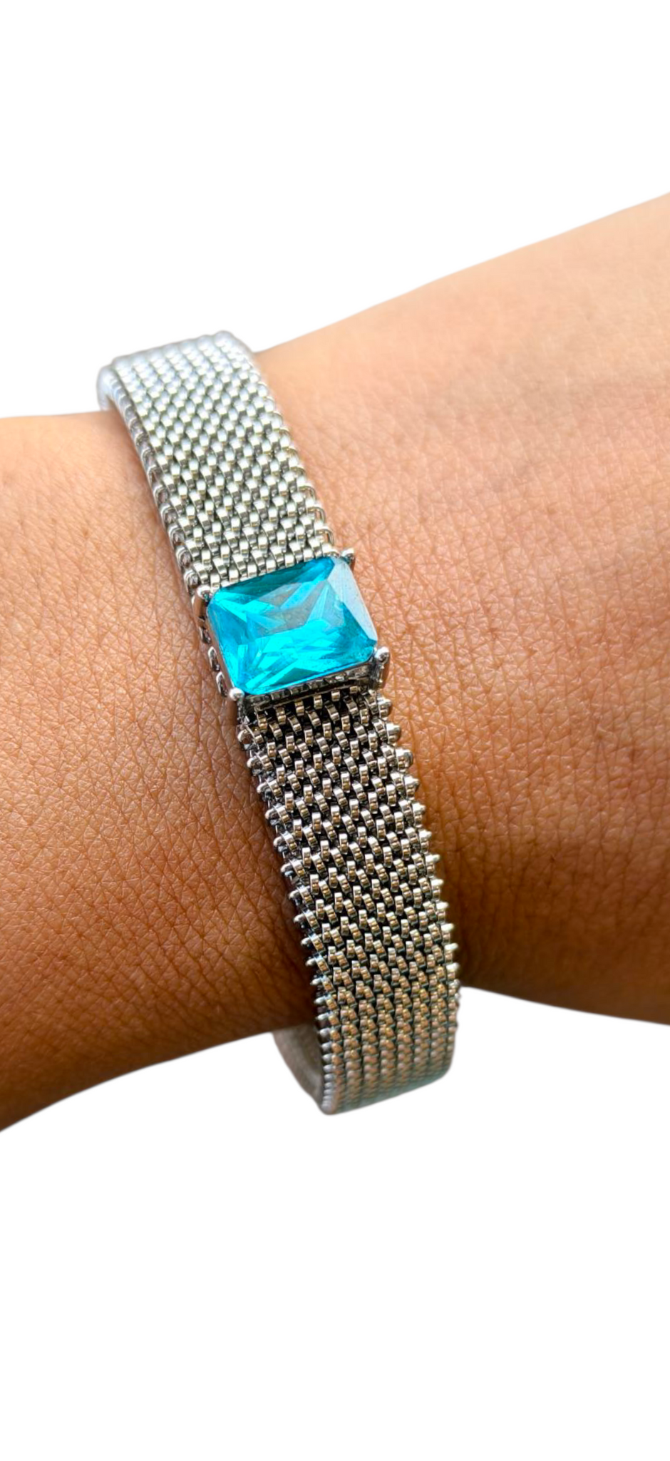 Azure Muse Bracelet combines silver mesh sophistication with a radiant blue gem that captures the essence of timeless grace.