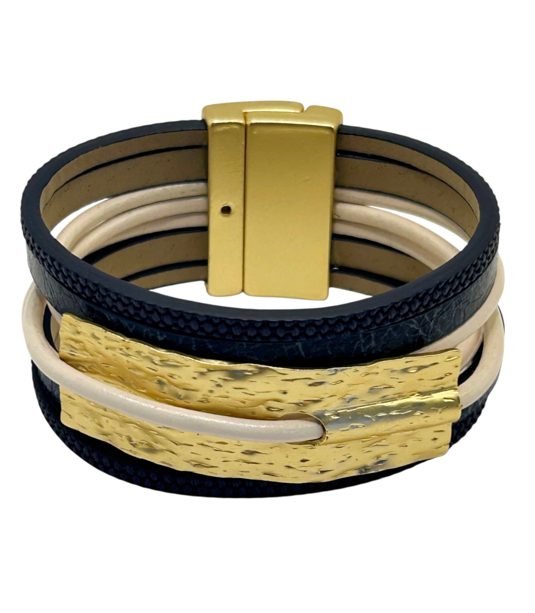 Embrace effortless bohemian charm with this layered wrap bracelet, crafted from natural-inspired leather and textured gold-toned hammered metal accents. Its free-spirited boho style blends earthy warmth with modern flair, while the magnetic clasp ensures comfort and ease of wear. A versatile piece that complements everything from relaxed beach days to contemporary urban looks.