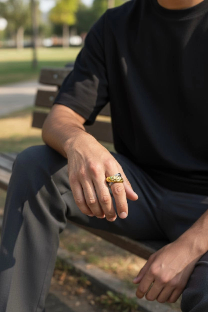 A crossover wrap ring blending two contrasting metals: silver with engraved scale-like patterns and gold with hammered texture. This design embodies a perfect balance of modern elegance and tactile artistry.