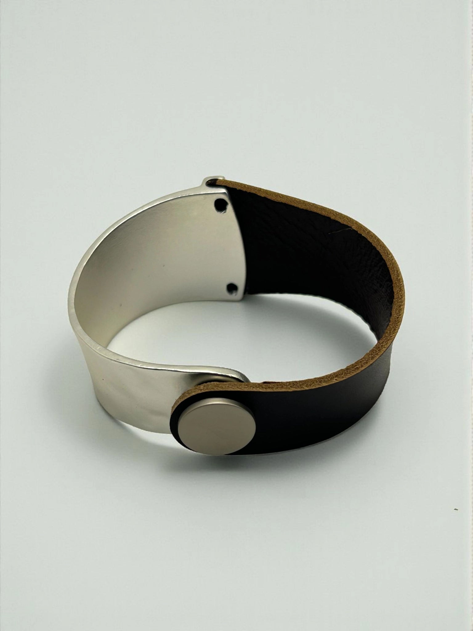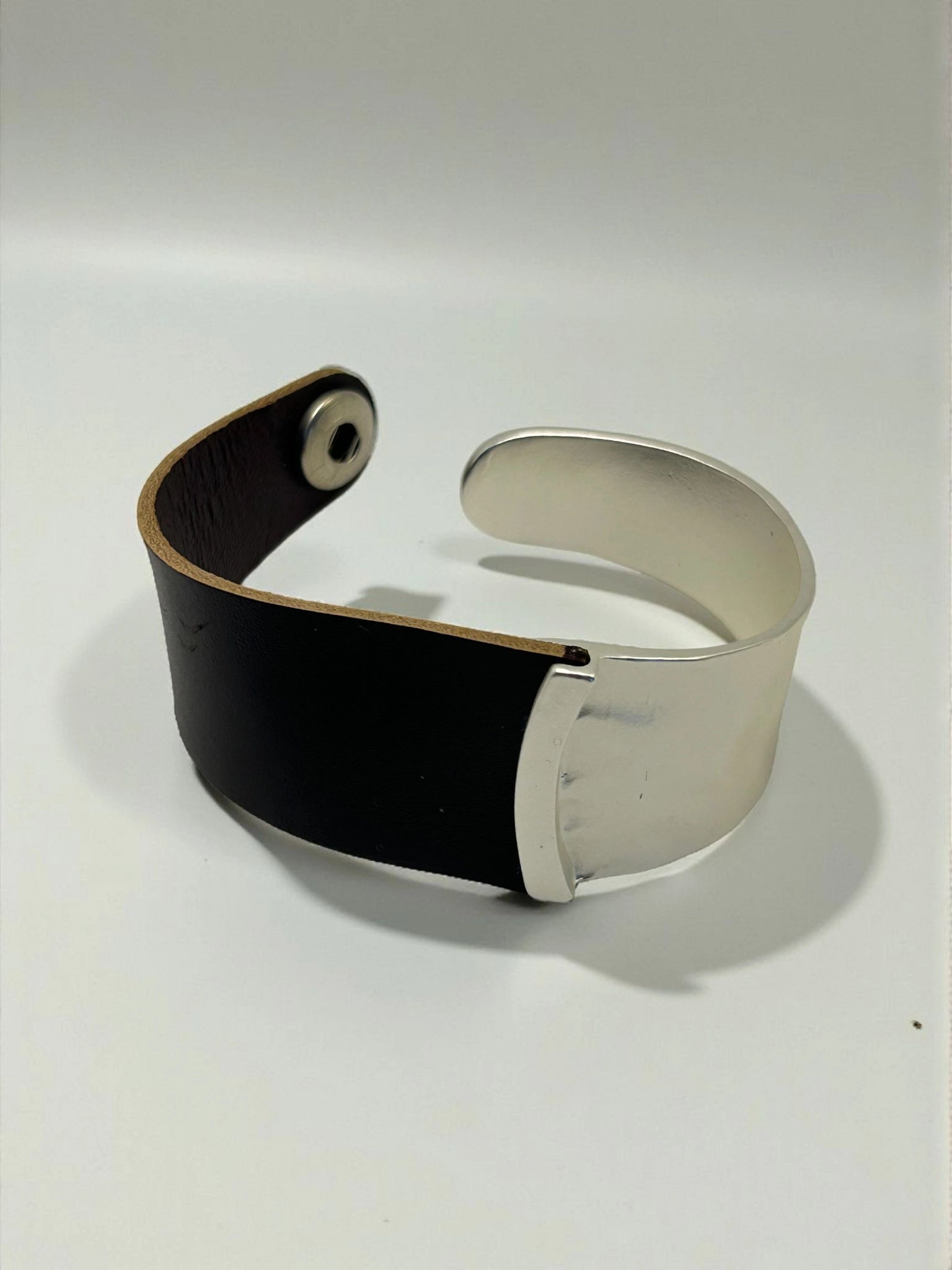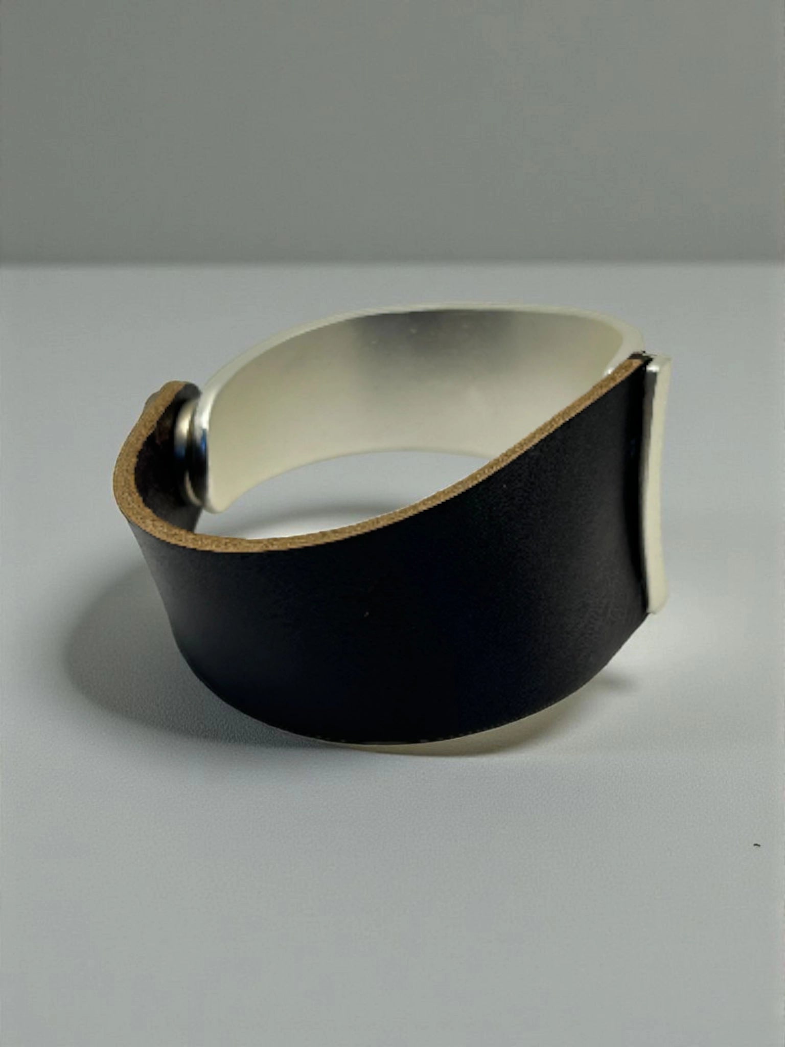 Elevate your casual yet edgy style with the LOEWE FOU Leather & Metal Cuff. This bracelet combines the durability of silver-toned metal with the sleekness of black leather. Its minimalist yet striking design makes it perfect for rock or street fashion looks. Easy to wear and versatile, it can be styled alone or layered with other bracelets for an instant statement on your wrist.