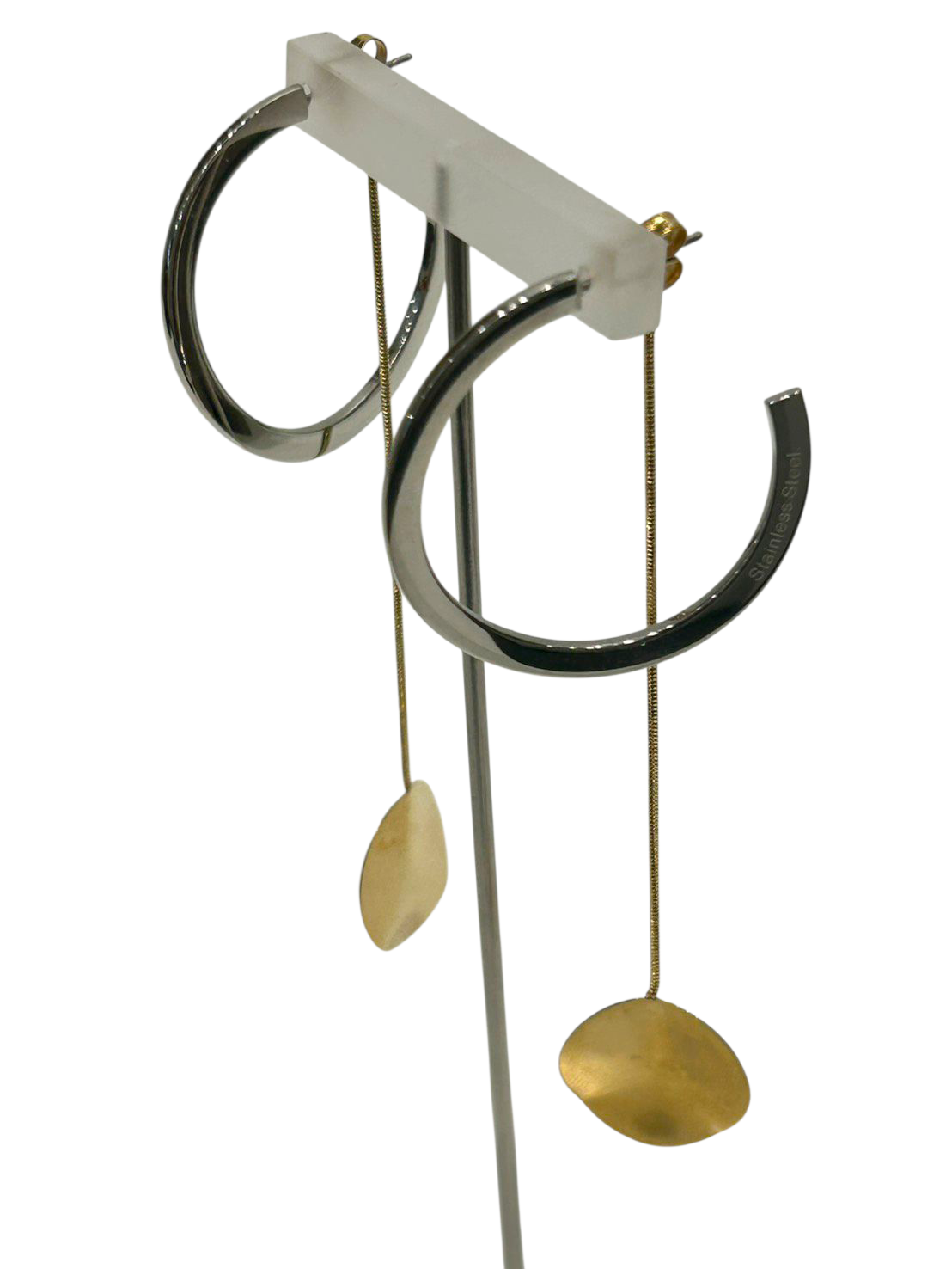 The Lunar Drop Earrings combine sleek stainless-steel hoops with golden organic drops, creating movement that feels soft, artistic, and effortlessly elegant. A perfect blend of contrast and harmony.