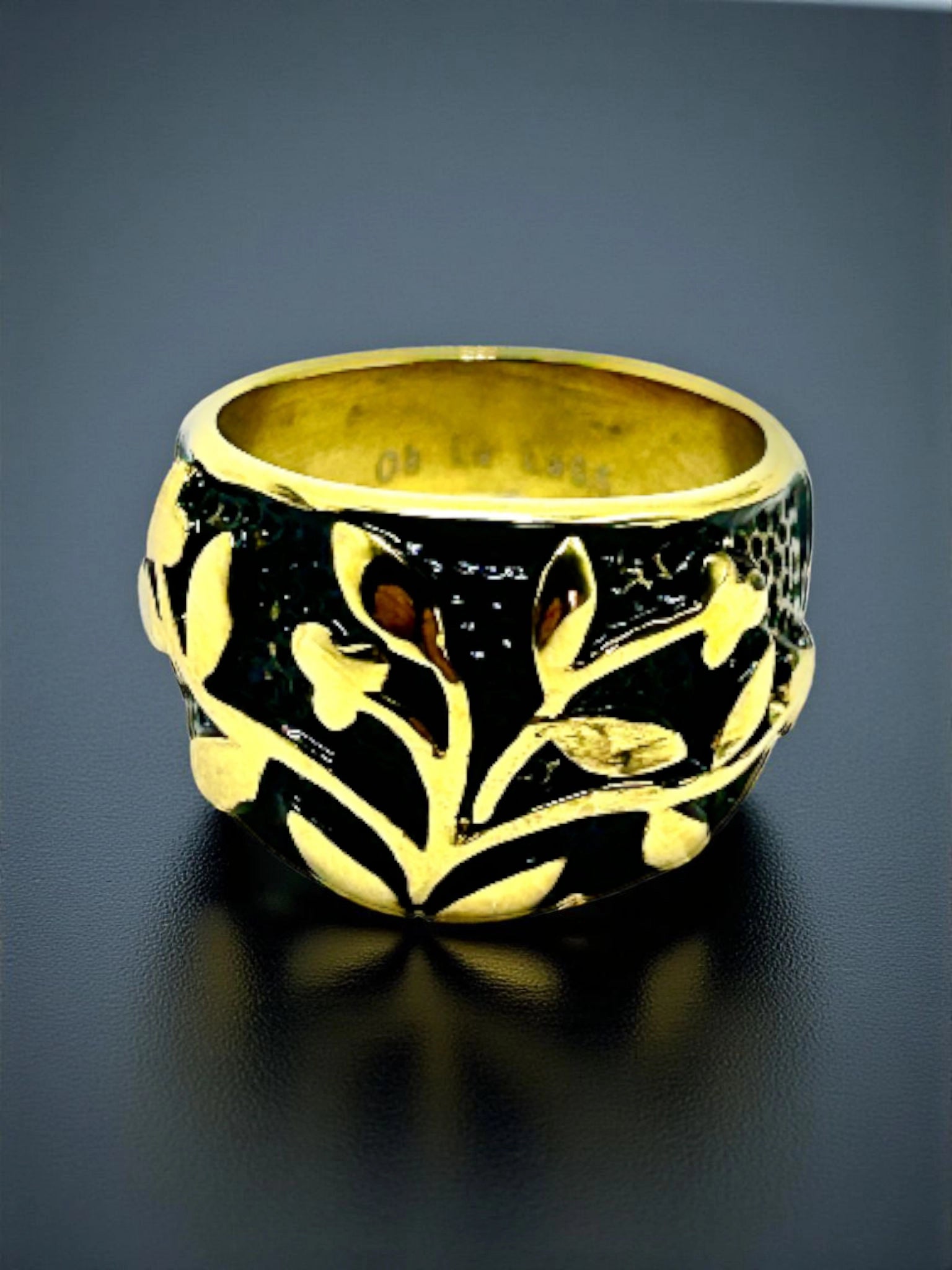 A bold black-enamel emblem ring accented with graceful leaf detailing. Perfect for lovers of meaningful vintage design and understated sophistication.