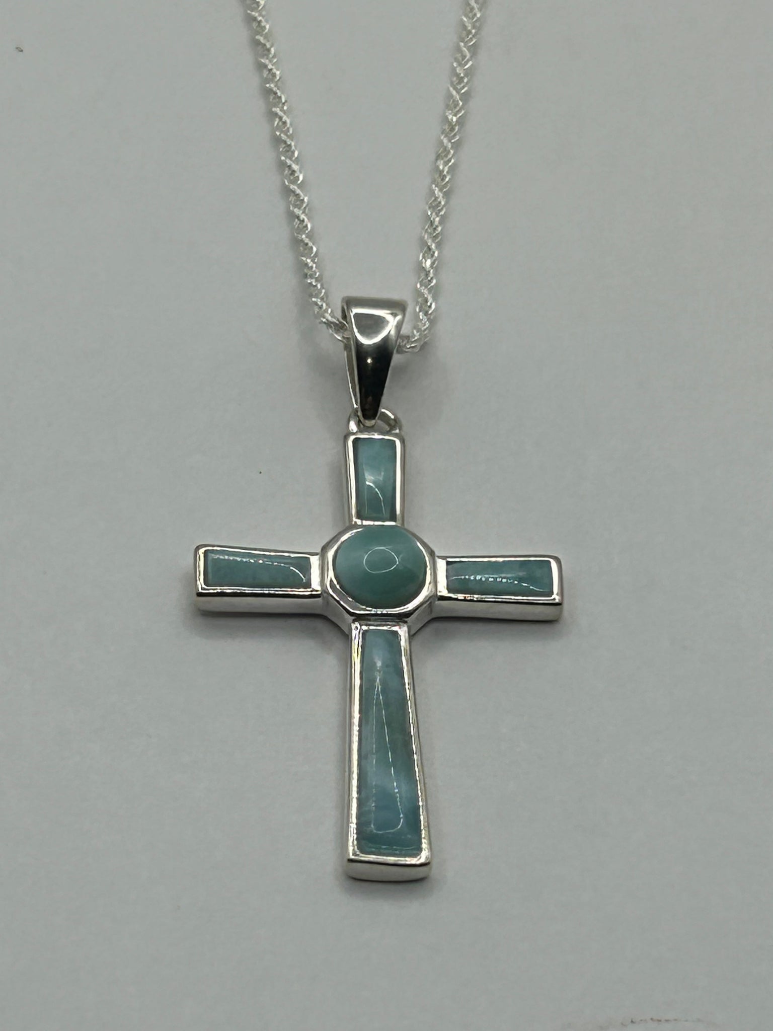 Carved from genuine Dominican larimar, this radiant blue cross shines with natural beauty and a sense of inner peace. Framed in sterling silver, it carries the soothing energy of the sea —a timeless symbol of faith and harmony.
