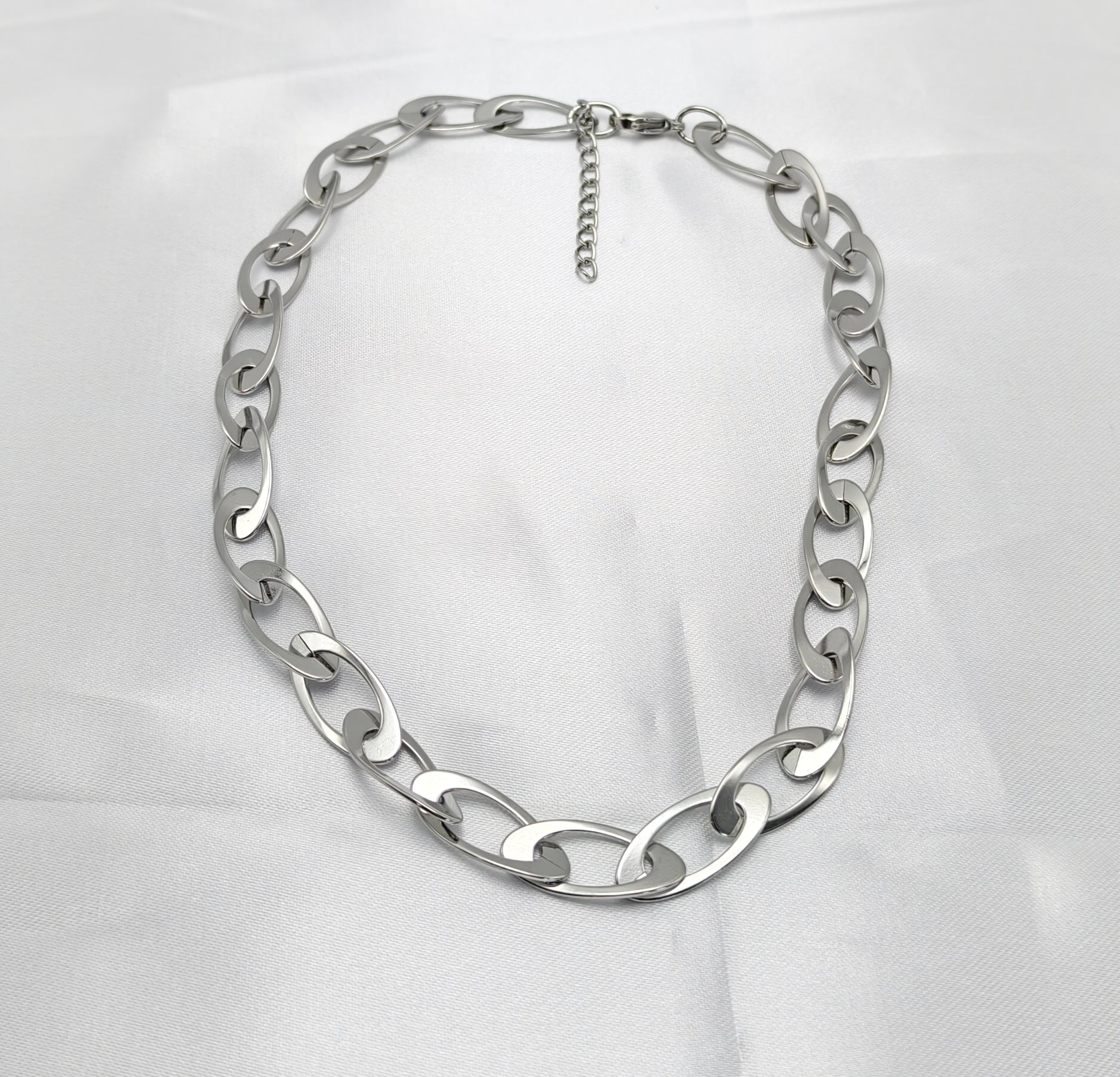 A modern silver chain with softly curved links. Minimal yet striking—perfect worn alone or layered for a bold, stylish look.