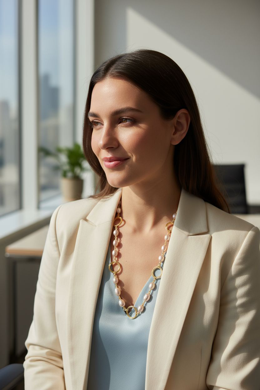 The Serene Loop Necklace embodies calm sophistication — a silver loop gracefully uniting pearls, symbolizing purity, peace, and timeless poise.