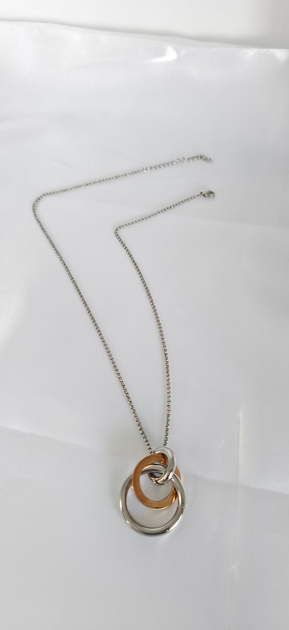A minimalist necklace featuring three interlocking rings in silver and gold tones. This elegant design symbolizes unity, trust, and everlasting connection. Versatile and meaningful, perfect for daily wear or as a thoughtful gift.
