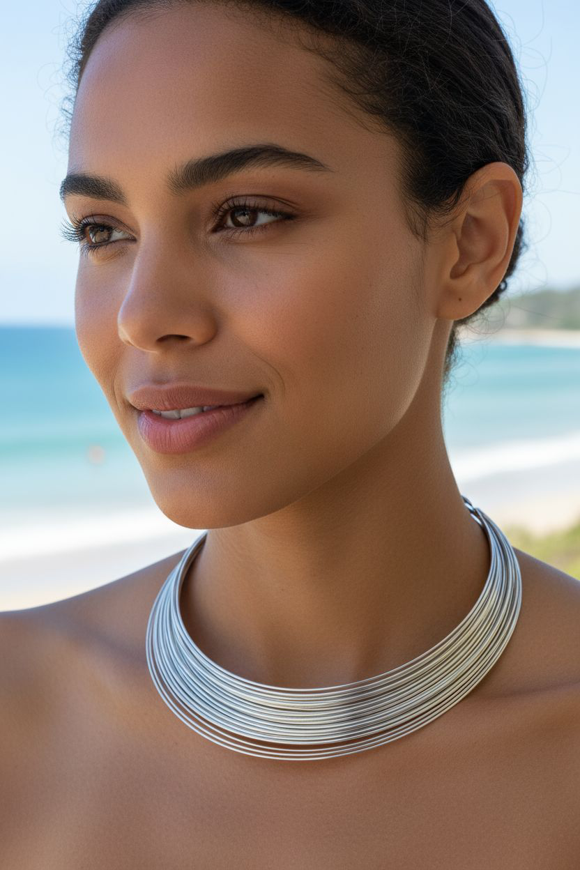 "Urban Weave Necklace blends contemporary design with subtle elegance. The thin stainless steel wires form a compact, flowing chain that embodies modern chic and versatility.